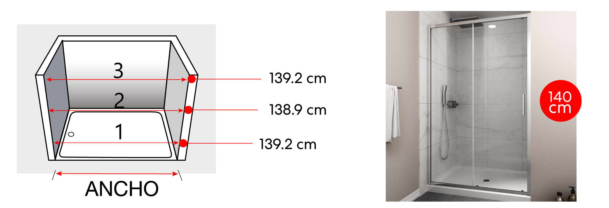 Debemos tener en cuenta que pueden variar las medidas. Es por eso que recomendamos medir en la parte inferior, en medio y superior. Con estas medidas utilizar el máximo y el mínimo para evaluar que mampara es la que más nos sirve.
