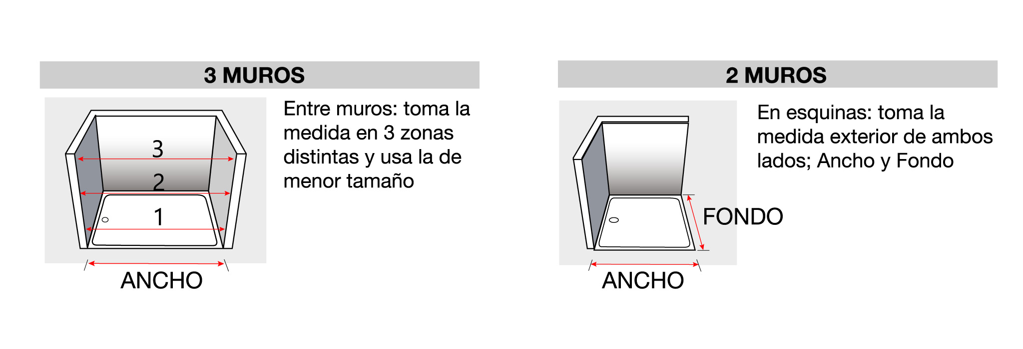 A la hora de elegir la mejor mampara debemos tener en cuenta que cada tipo de mampara cuenta con un rango de medidas específicas para cada modelo. Para saber qué mampara es la que nos sirve debemos medir los muros de nuestro baño de la siguiente manera